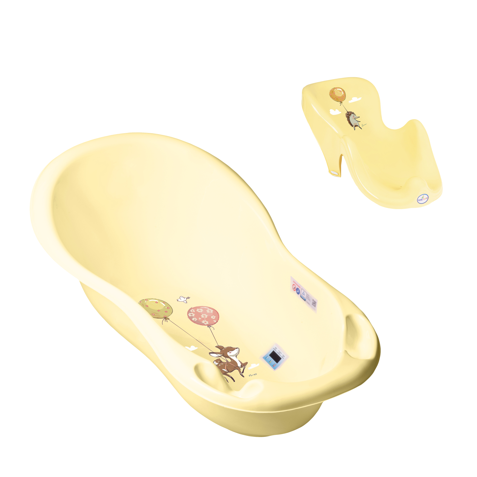 Are un senzor de temperatura care ne indica cand apa este optima pentru a imbaia copilul.