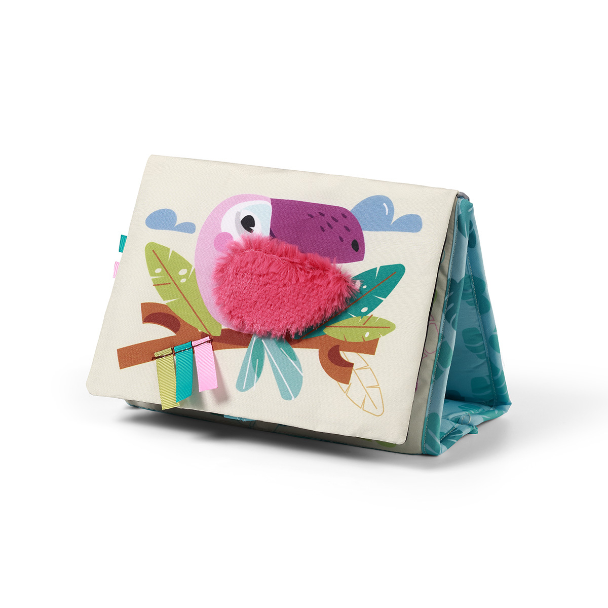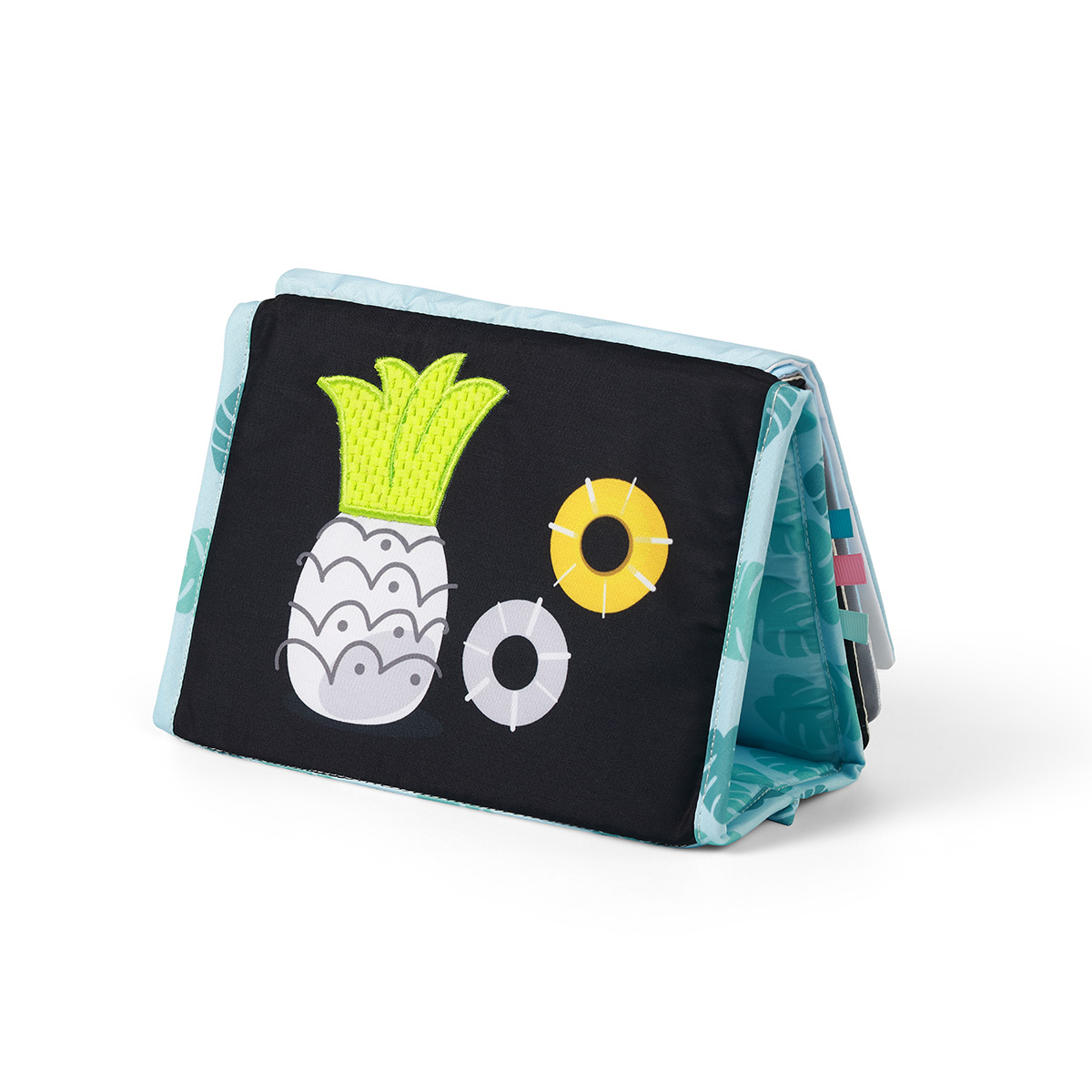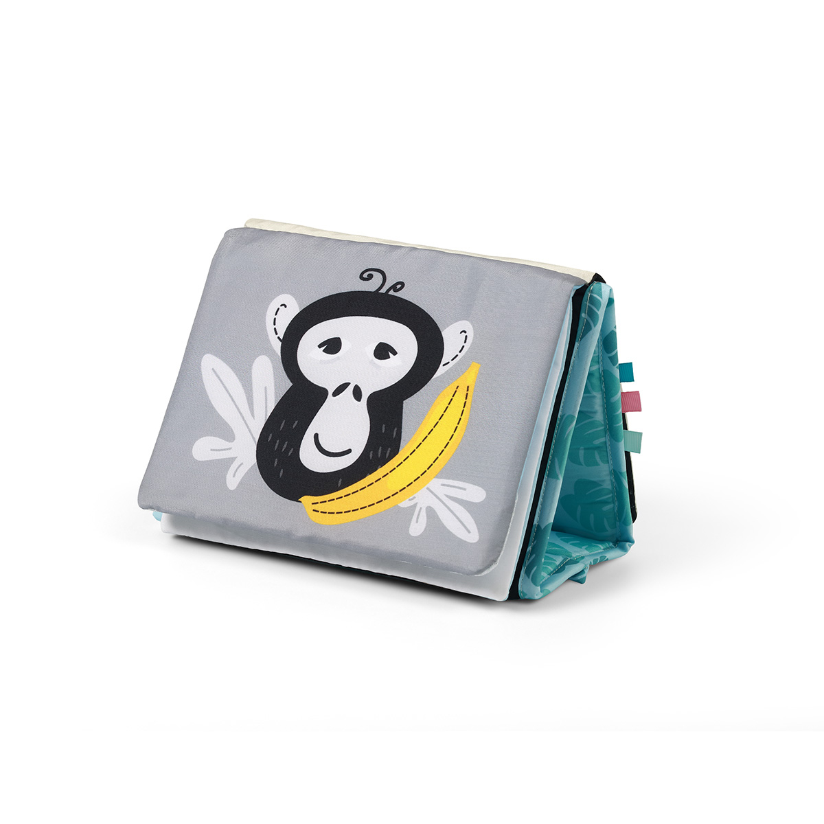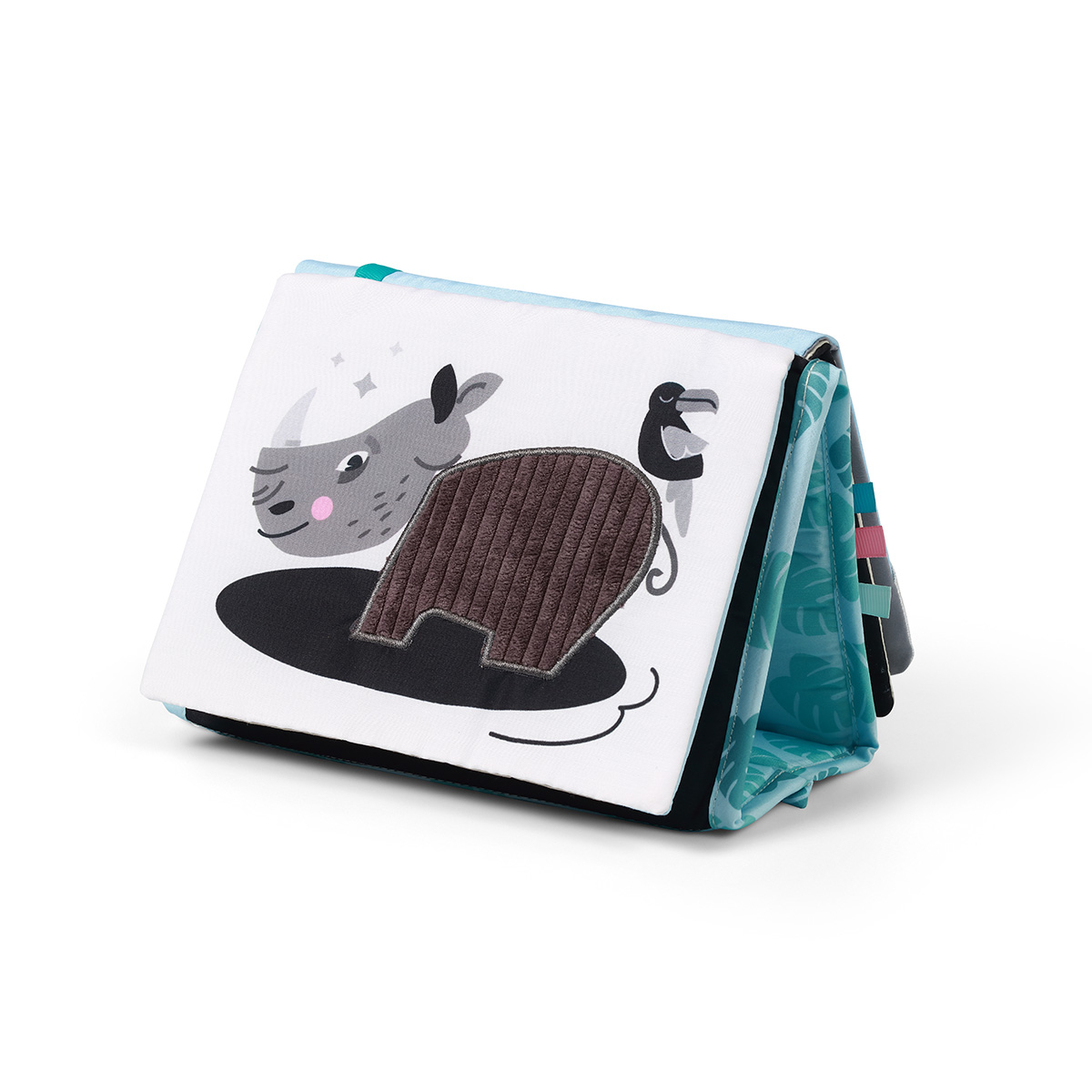 Cartea are o baza datorita careia o poti pune pe diferite suprafete. ÃŽncurajeaza copilul sa stea culcat pe burta si sa se ridice.