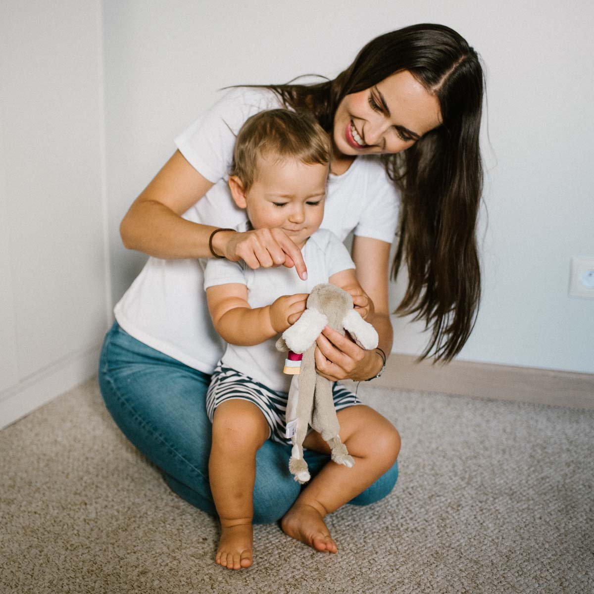 Este mai mult decât o jucărie moale obișnuită. Este furnizata cu un suport pentru suzeta la îndemână, în timp ce etichetele colorate încurajează copilul să se joace și să descopere lumea.