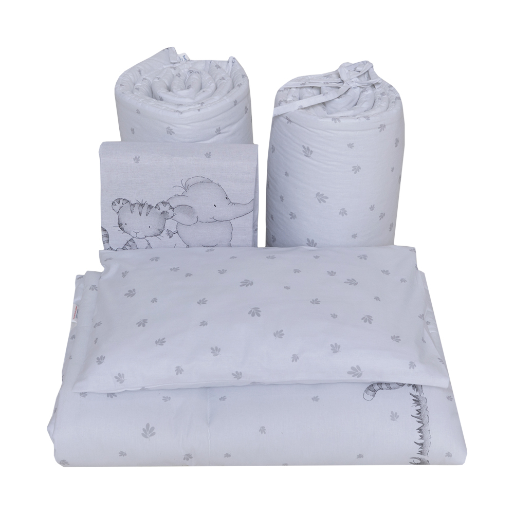 Set lenjerie bumbac cu baldachin 6 piese pentru saltea de 120 x 60 cm, Safari Friends alb, Beberoyal, LJ-006-105