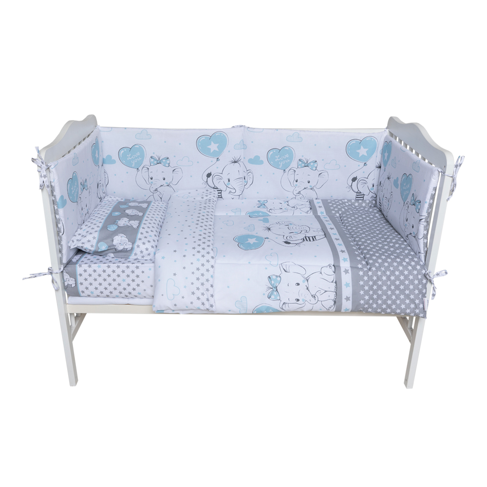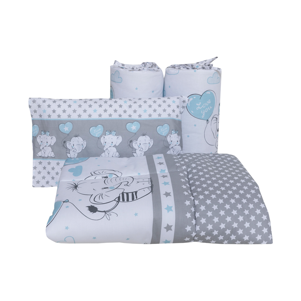 Set lenjerie bumbac cu baldachin 6 piese pentru saltea de 120 x 60 cm, Love Elephants Blue, Beberoyal, LJ-006-101